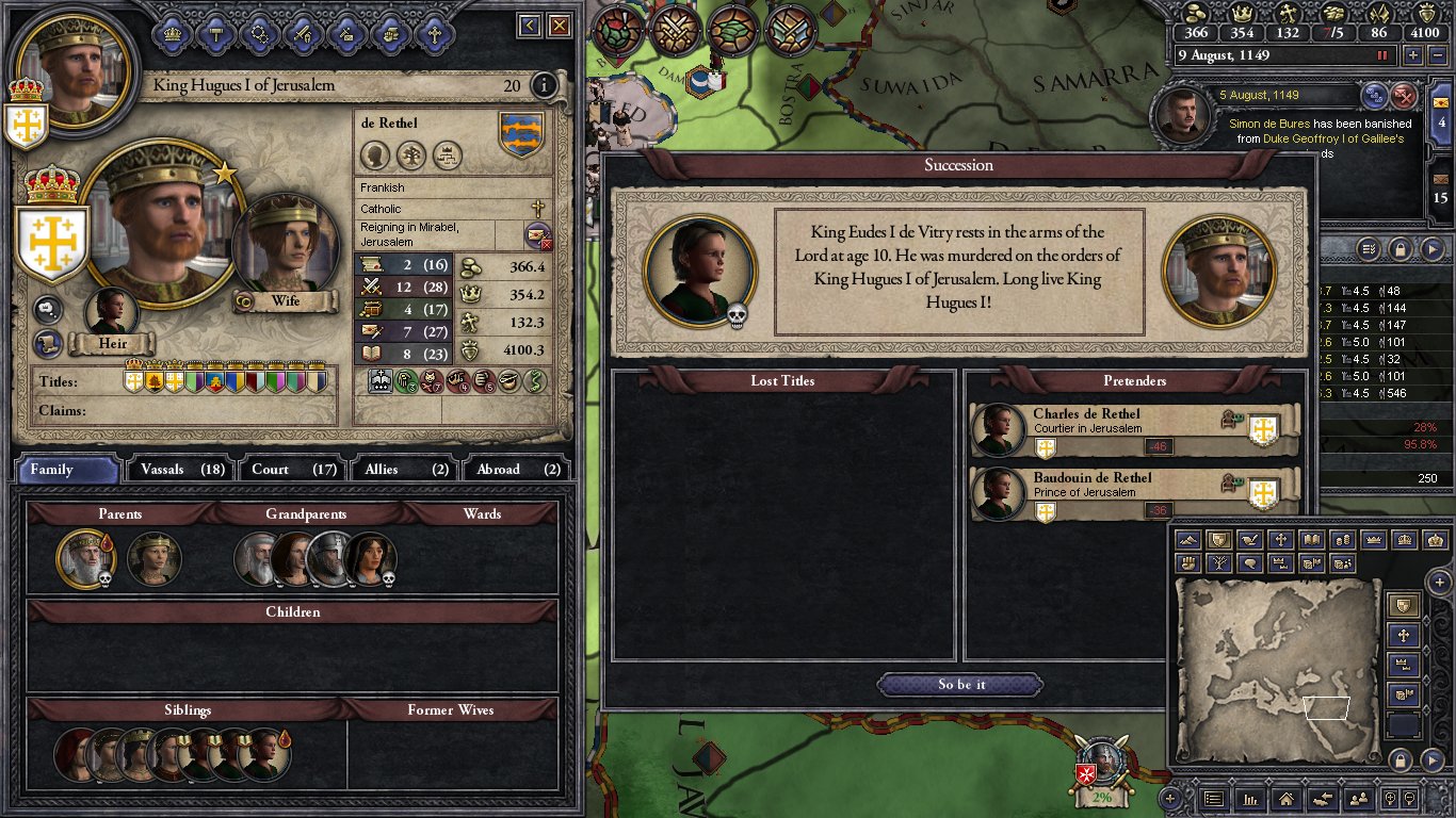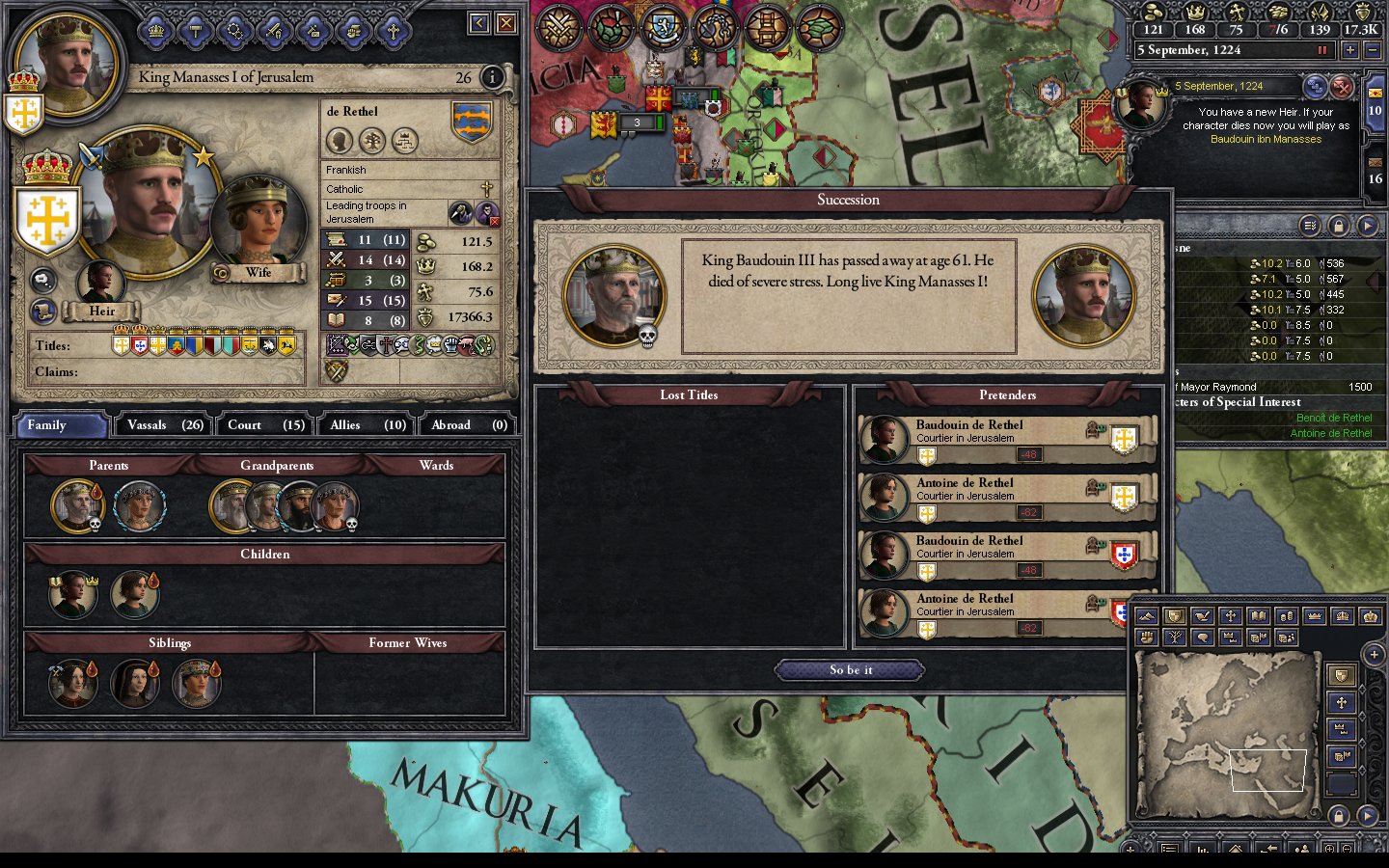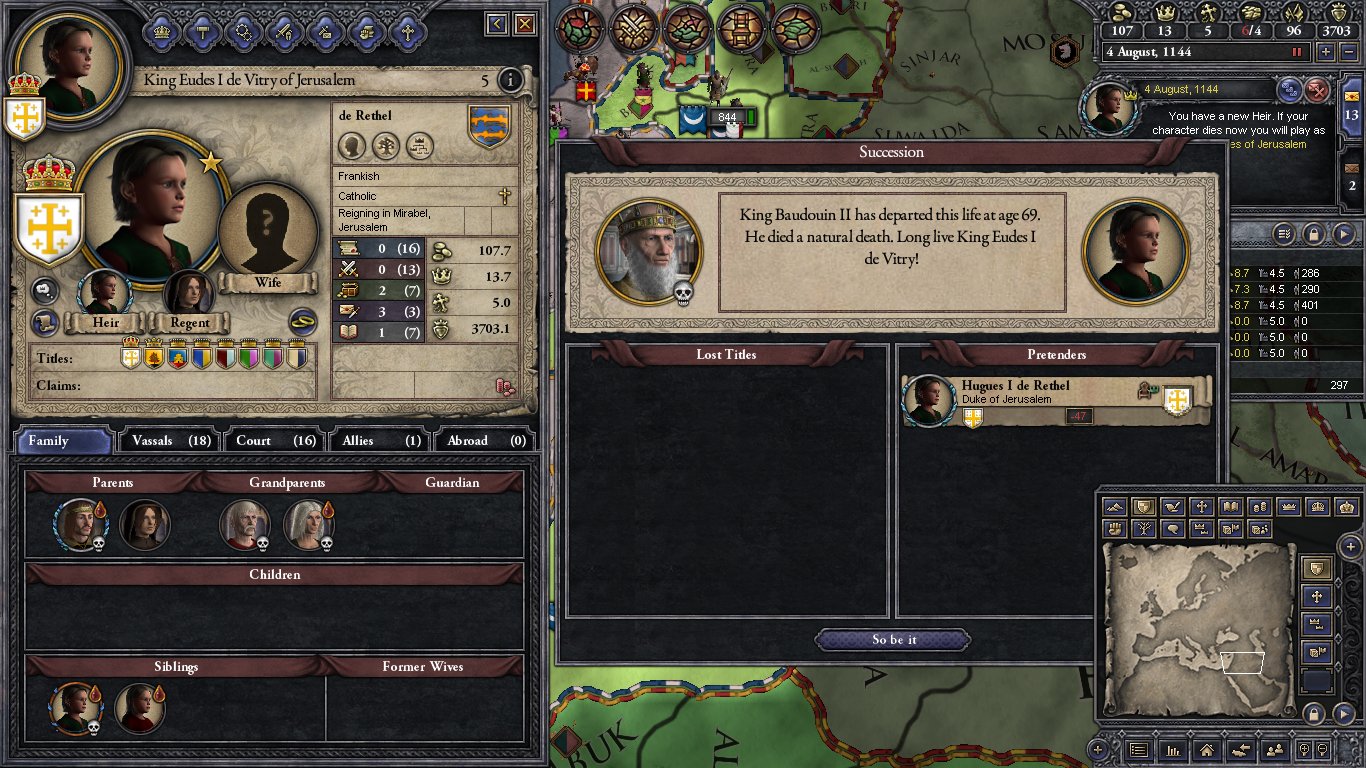 In 1124 Baudouin is 49 years old. He has 4 daughters; Melisende (19), Alice (14), Hodierne (13) and Yvette (5). His wife Morfia is too old to provides another child. In real life he was devoted to her and refused to put her aside and replace her. He also has 2 sisters, only one of who is married, and a nephew Ithier who is part of the dynasty by his sister Matilda. Both of his brothers are dead and his only ally is the Duke of Armenia Minor. The counties he controls are not centrally located. He is surrounded by Muslims; Fatimid Shite Egypt to the West, and Sunni's to the East. The laws of the kingdom are Agnatic-Cognatic Gavelkind so the younger daughters will break up the realm when Baudouin dies and the next king will most likely be Melisende's husband.
