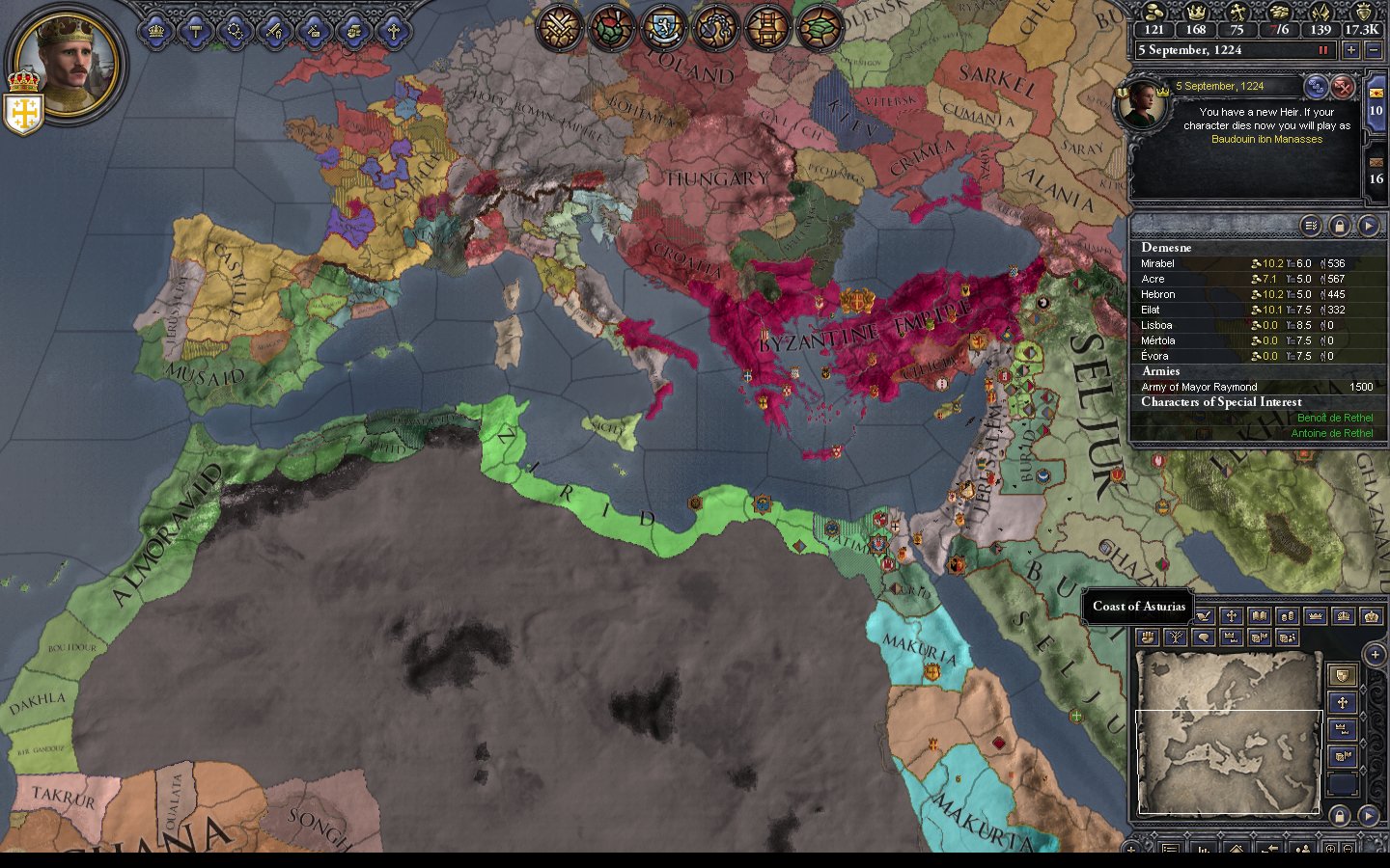 Baudouin managed to hold on to the kingdom, not lose any territory to Muslims and actually gained territory from Egypt. He fought 5 wars with Fatimid Egypt all won and one with technically one with France but he made no attempt to contest the territory in France. His vassals also gained territory in southern France from an opportune inheritance. That territory is squeezed between France and Barcelona which also controls Provence. A final county, Taranto in southern Italy is isolated and eyed by Apulia. His major accomplishment seems to have been stopping the realm from disintegrating through Gavelkin succession. Though having it passed to Eudes may end up with a worse situation.