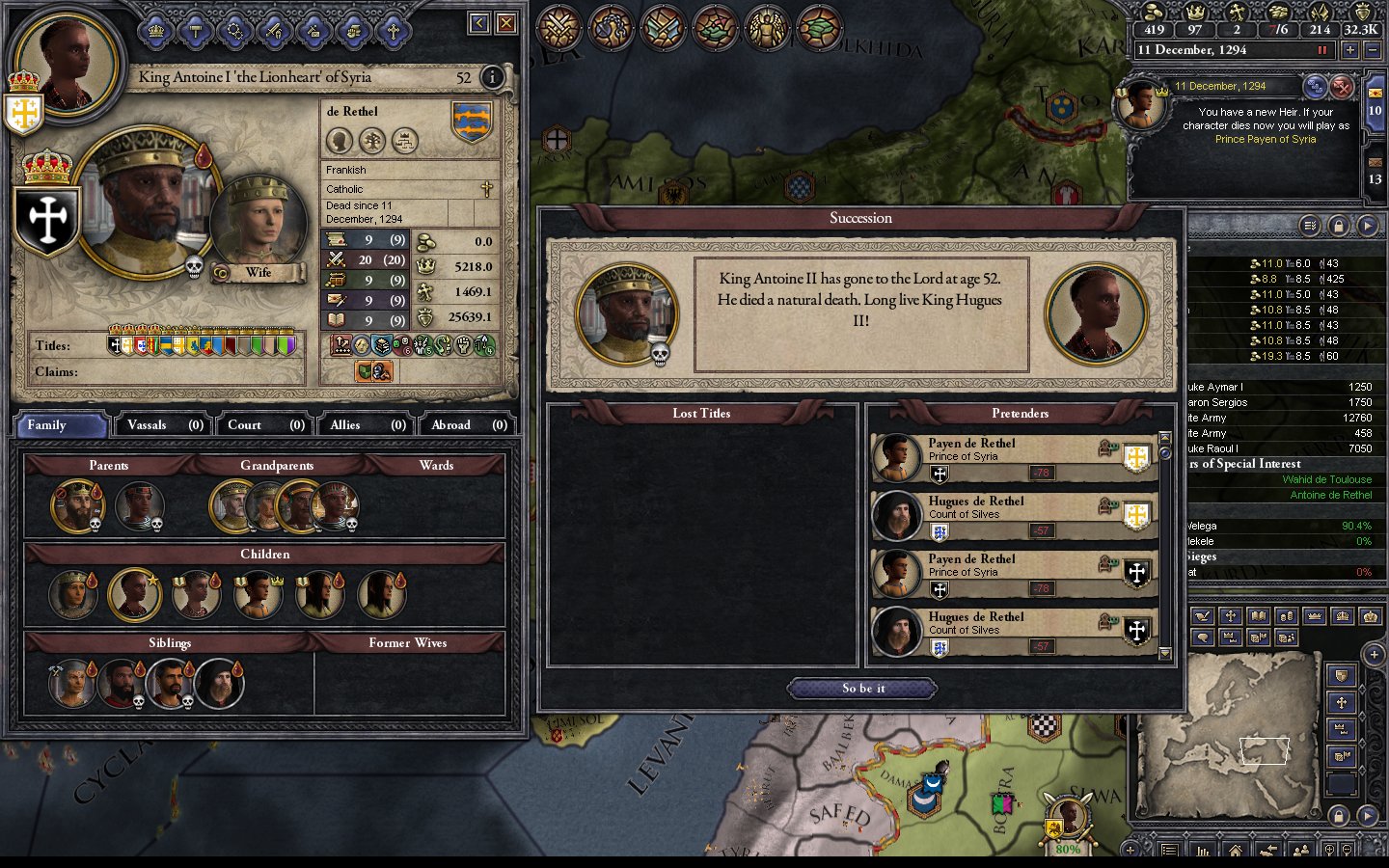 Antoine had problems getting an heir. He went through 3 wives before a single son was born. He leaves that son 15 years old and unprepared for the throne. His brother Payen at 11 would be a better choice. He managed to hold together the realm, by lucky, the Mongol defeated the rebel armies back in 1260 for him. He proclaimed himself King of Syria. Luckily the Ilkhanate did not attack him. Despite being on the throne for many years he seems to have done little. He is succeeded by his son Hugues.