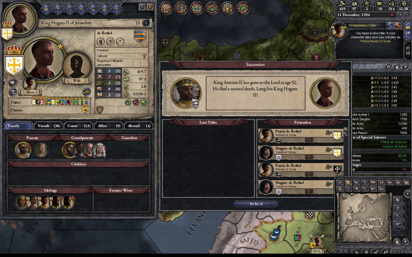 Hues II comes to the throne unprepared. He is lacking in intrigue. and slothful. His vassals dislike him, severely. He is embroiled in a long war for Abyssinia that seems to never have and end. He has a younger brother, and older sister who sister who sits as the Queen of Castile, and two younger sisters. His genius Uncle Hugues will be a problem, particularly since his genius 9 year old son will be around for most of Hugues II reign. The Pope dislikes young Hugues too.