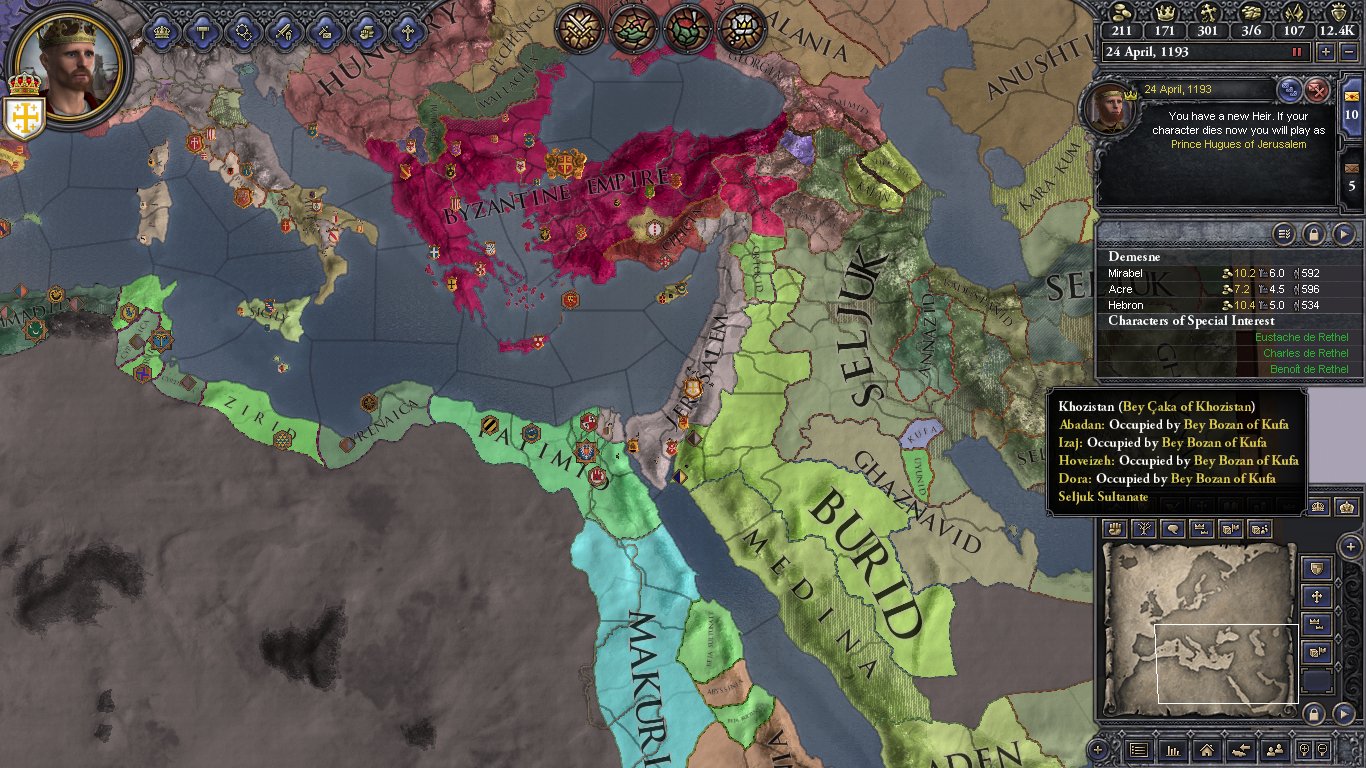 - 1145.6.1 The battle in Antioch is lost. Prince Hughes (who hates me) is appointed spymaster.