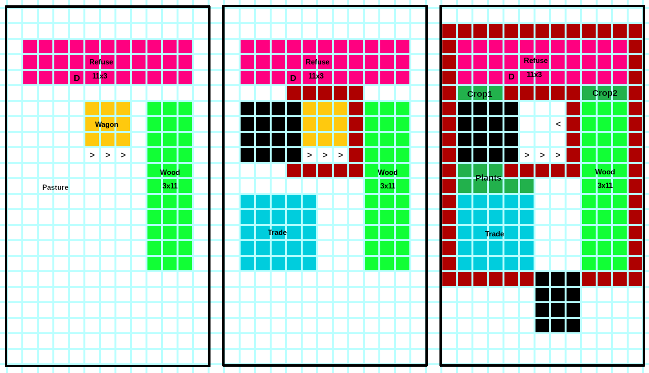 Underground aquifer dig. : Room for embarked goods, Carpenters shop, mechanics shop. Corkscrews, Blocks, mechanisms, pipe sections. Small farm.