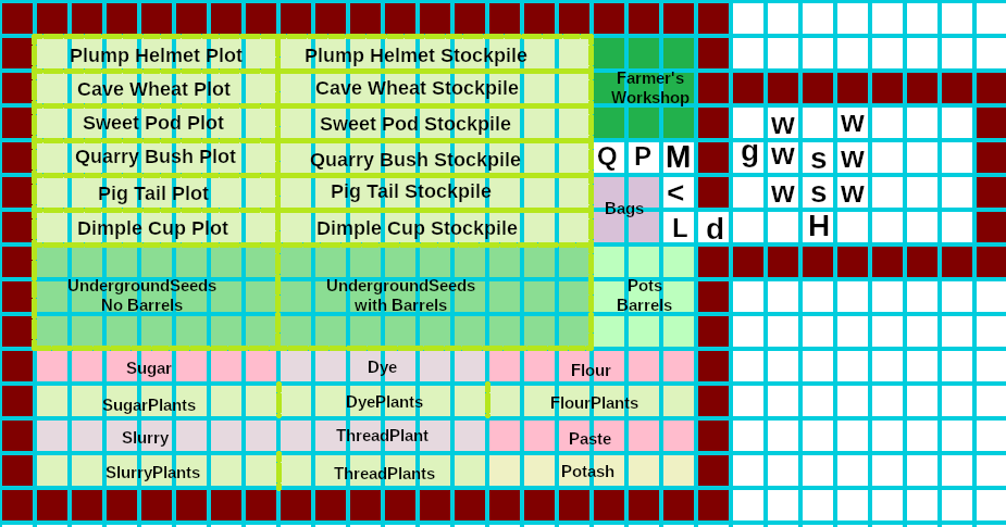 A Bag stockpile and a Barrel/Pot stockpile which give to the Millstone and the UndergoundSeeds stockpiles can help facilitate jobs.