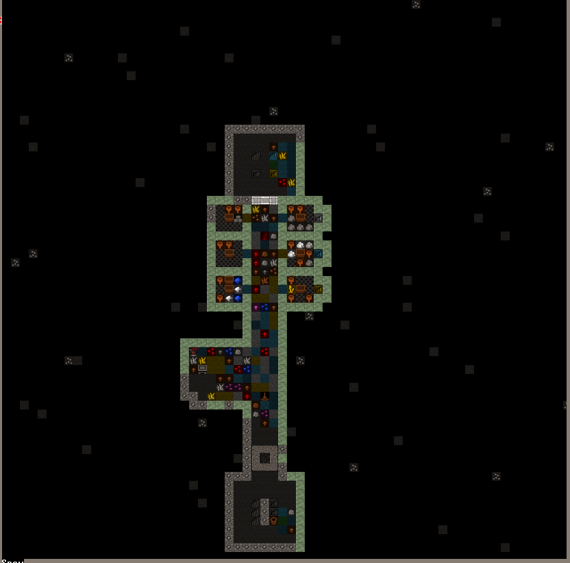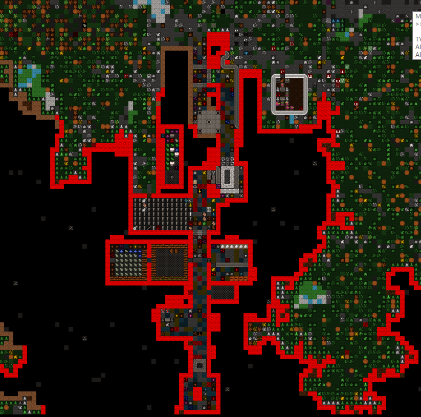 Level 1 is located within the red sand plateau. It is accesed from the surface via a three wide ramp leading down from the citidel. The pervious walled up entrance tunnel can be seen to the left of the Trade Depot. Some of the red sand exterior walls have been replaced with stone for security. After passing down a tunnel a visitor will encounter a battery of cage and stone traps. Beyond that is a retracting bridge over a pit of spkies. The bridge is surrounded by fortifications archers can fire through and just past the retracting bridge is the main gate to seal the fortress. Both the gate and bridge are tied to a single pressure plate and active at the same time. The hall beyond is used to stage military squads in the vent of an incursion. The trade goods stockpile sits off the hallway. This has been full of mugs for nealry 15 years now. A three wide stair leads downward into the fort. At one point the hallway south was walled off, this has been opened up again. The main portion of level 1 was initially dedicated to crops and turkeys. Both have since been relocated to level 2 because of repeated tree root incursions. The level's meeting hall has two levers, one for the rear gate and one previously for the gate now occupied by the walls seperating the level from the entrance area. In the rear is a three wide stair down.