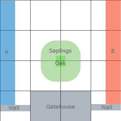 The Giant Oak and Saplings will attack any warrior who enters the 8" clear area, or tries to pass through the gatehouse.